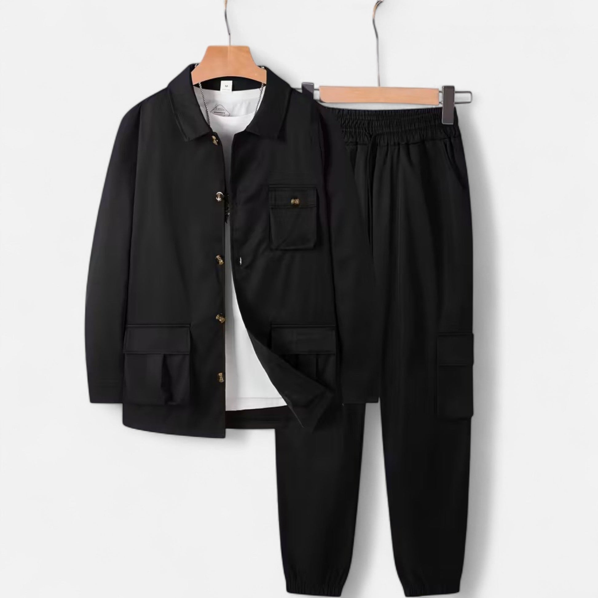 Das Ruben Workwear Set bietet die perfekte Balance zwischen Komfort und Struktur. Die langärmlige Hemdjacke mit Knöpfen und Brusttaschen sorgt für einen maskulinen, lässigen Look, während die Jogginghose mit elastischem Kordelzugbund maximale Bewegungsfreiheit und Bequemlichkeit bietet. Ideal für Freizeit, Reisen oder entspannte Arbeitstage – ein Outfit, das durch seine praktischen Details und hochwertige Verarbeitung überzeugt.